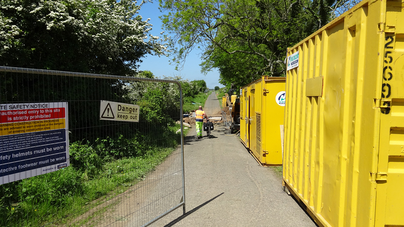 Straks rechtsaf richting het bos en richting Fenwick. Ik liep hier ook op de St Cuthberts route maar dan door het bos natuurlijk en niet over de weg. Als we af willen slaan staat er ineens een bord met een diversion en een melding dat de weg afgesloten zou zijn. Niet zozeer de weg, maar een brug. Brug? We stoppen en turen op de kaart. Welke brug? Welk water? De omleiding loopt via de drukke A1. Dat kan niet de bedoeling zijn voor fietsers toch? Wat nu?