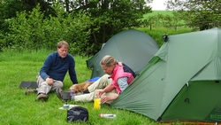 De app heeft zijn werk gedaan want het zonnetje schijnt al uitbundig en de tent staat precies goed. Het is heerlijk rustig om ons heen. Vogeltjes en een stromend beekje. Wat wil je nog meer? Dit is nu echt genieten. We hebben geen haast, dat Berwick halen we echt wel vandaag. We gaan dus eerst rustig ontbijten. S. eet scrambled egg en ik neem rijstepap met aardbeien. Dat vind ik akelig zoet. Het ei blijft favoriet denk ik. We drinken er warme choco bij. Gelukkig hebben we een hele voorraad ingeslagen een paar weken geleden, want we drinken dit inmiddels ook tijdens kano tochtjes.