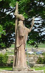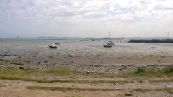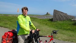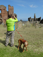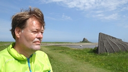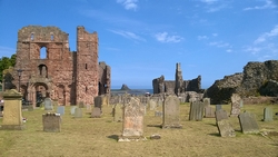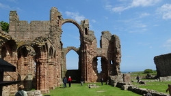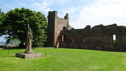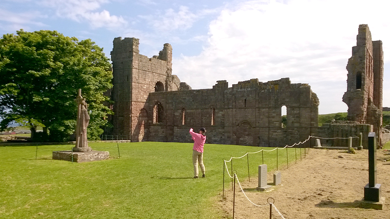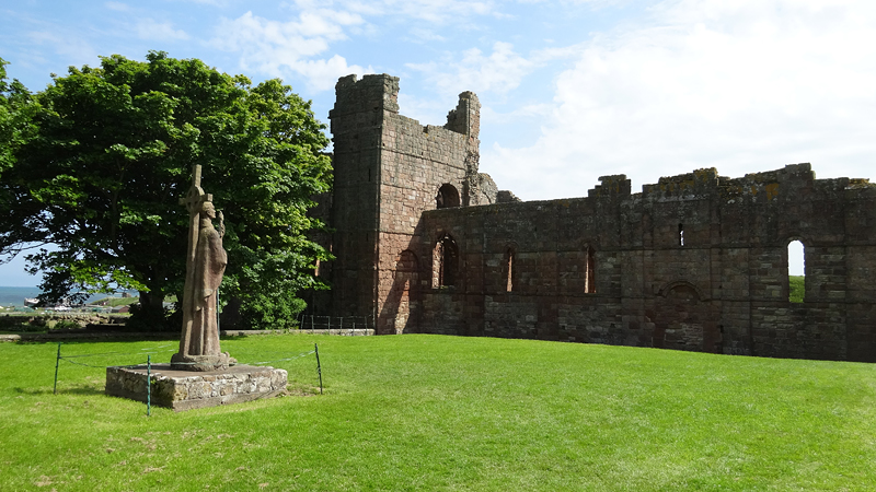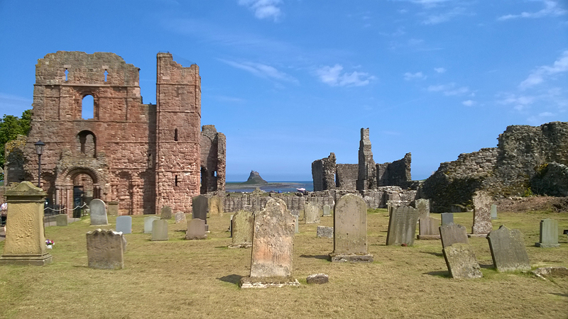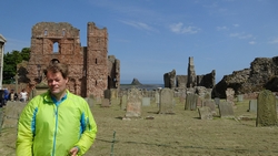 Ik herinner me dit van de St Cuthberts way. Kwam ik in mijn korte broekje aanlopen en liep ik ineens tussen alle dik ingepakte wandelaars. Brrrrr. Maar niet zeiken en doorfietsen. Na 3 km gil ik tegen de wind in dat S. misschien wel eens voorop kan gaan fietsen als stormram en dat scheelt een stuk. Hij gelooft alleen niet dat we pas op de helft zijn! Maar we hebben echt 7 km nodig van de lunch plek naar de priory op het eiland en daarvoor hebben we meer dan een half uur nodig. De accu van de camera van S. is ineens leeg en die laden we op met mijn powerbank. S. neemt mijn camera voorlopig dus ben ik even zonder kiekdoos.