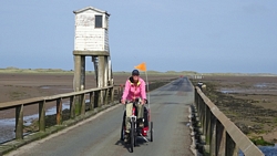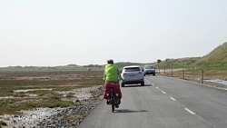 Na de lunch gaan we verder richting de causeway. We nemen braaf het fietspad naast de weg maar dat is een beetje kloterig pad met kiezels en rommel. Maar even later rijden we dan toch de causeway op. En dat wordt bikkelen. Wat een wind tegen ineens en het is nog ijskoud ook.