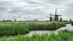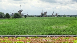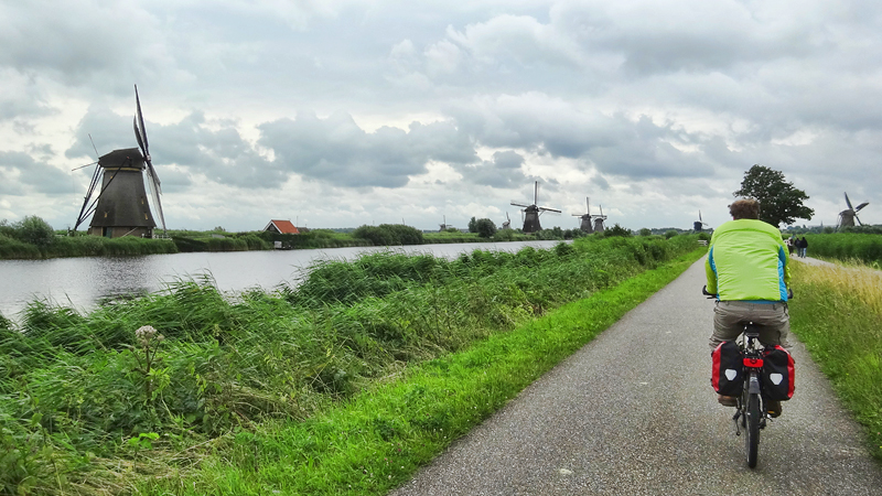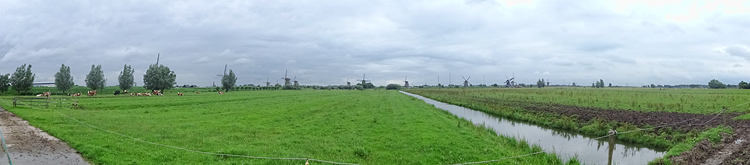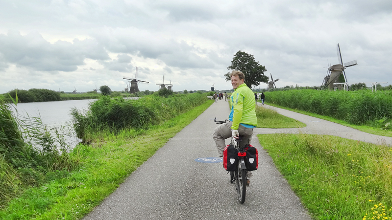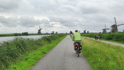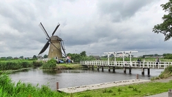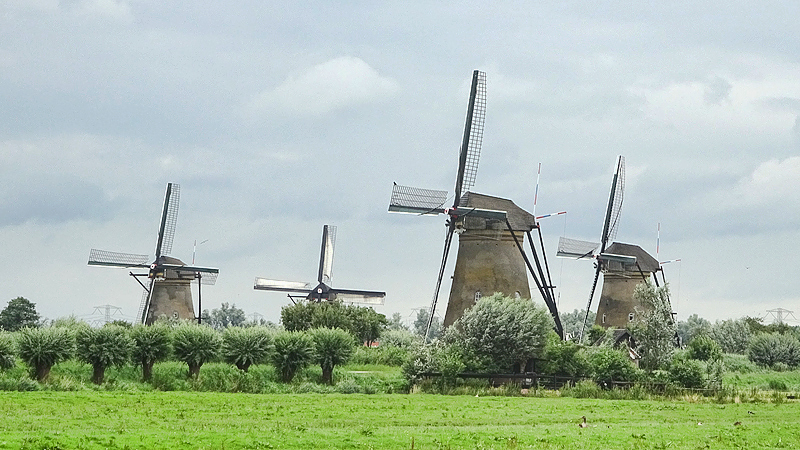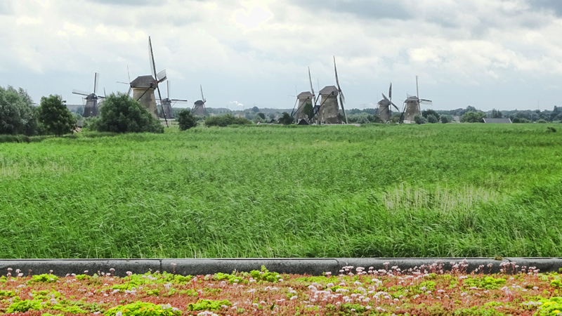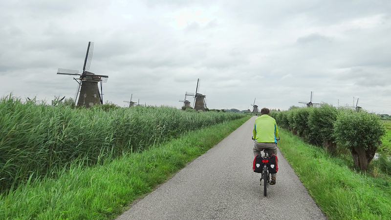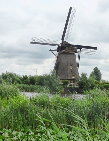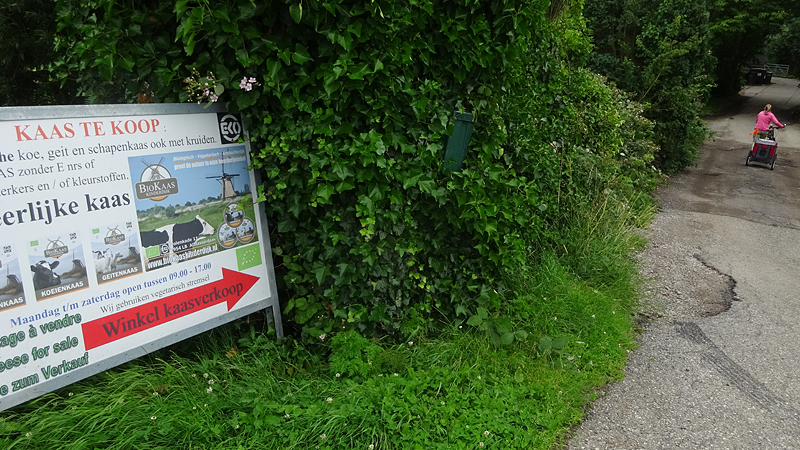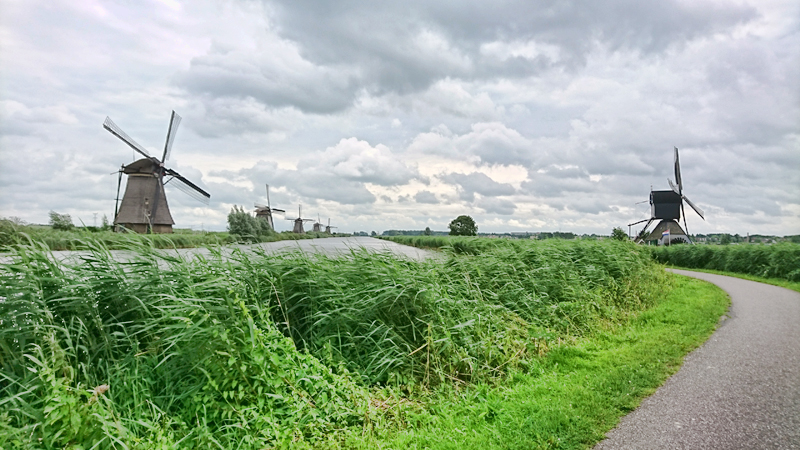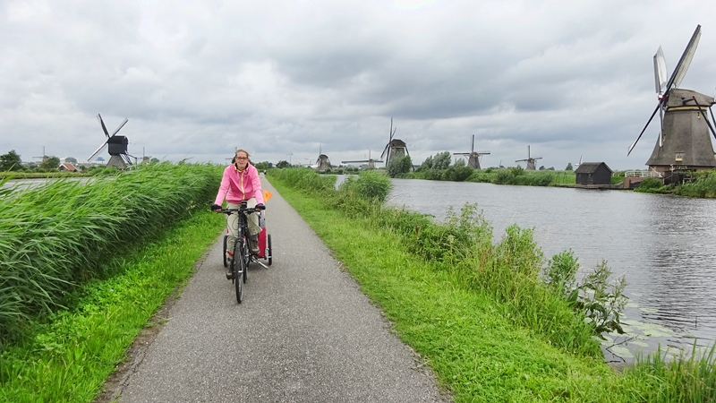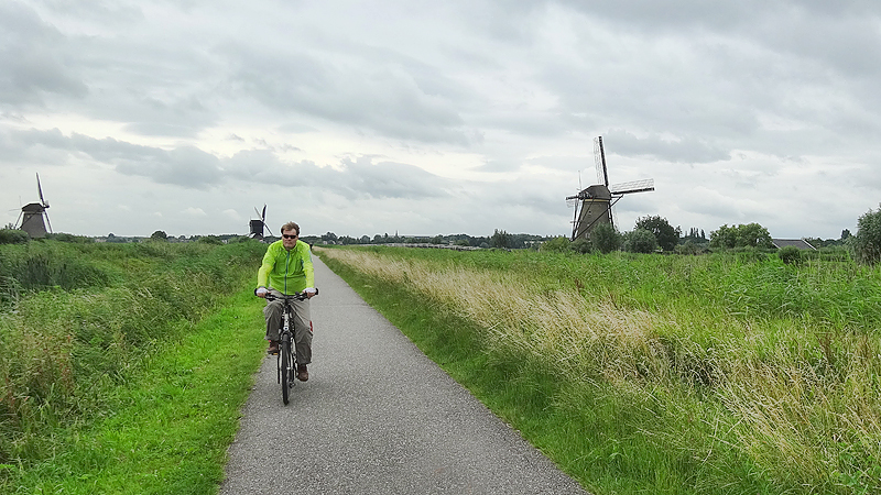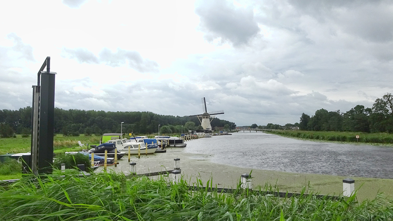 Nadat we twee stukjes lekkere kaas gekocht hebben, fietsen we weer verder richting de pont. We rijden weer langs de molens en toch blijft het leuk!
