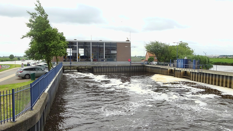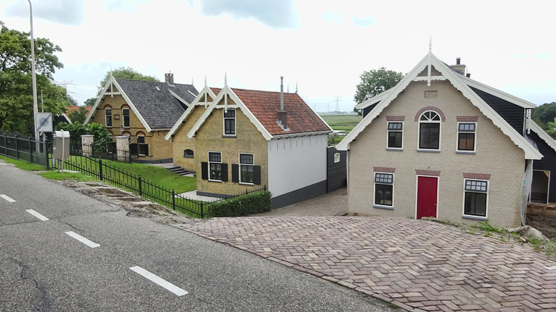 Aan de overkant slaan we rechtsaf en fietsen even over de dijk. Daar zijn aardige huizen te bewonderen. Als we linksaf de polder inslaan, komen we ook langs een gemaal.