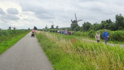 Dan rijden we het fietspad op. Best druk nog voor een vrijdag en je moet vooral goed opletten dat je geen wandelaars aanrijdt die alleen maar naar de molens kijken, foto’s maken en vooral niet opletten. Toch blijft het leuk al die molens bij elkaar en ook wij maken natuurlijk volop foto’s.