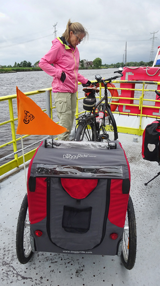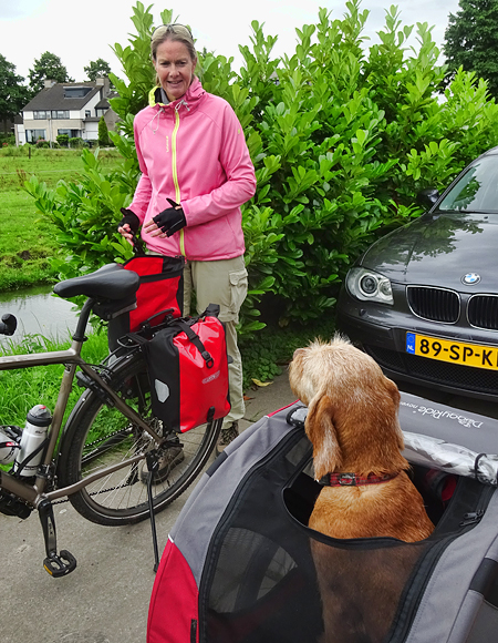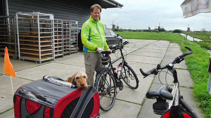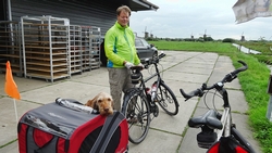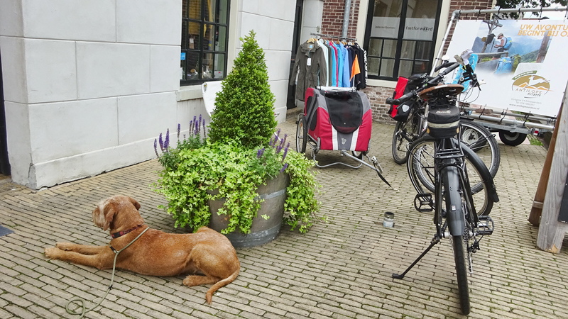 Vandaag gaan we even naar Alblasserdam terug om een nieuwe stuurpen te laten monteren op de Santos. Een centimeter langere stuurpen zou net iets beter zitten waarschijnlijk. Omdat de route vanaf huis eigenlijk heel mooi is, besluiten we dat dus met de fiets te doen. Eerst met het pontje over naar Krimpen aan den IJssel, vanaf daar richting Loetbos en door naar Krimpen aan de Lek waar we de pont naar Kinderdijk nemen. Vanaf daar dan via de molens naar Alblasserdam. Aanvankelijk twijfelen we nog even of we woef mee zullen nemen in de doggyride maar we besluiten dat toch te doen. Achteraf heel fijn maar daarover later meer…..