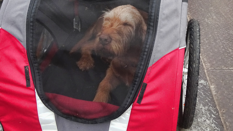 Het duurt allemaal erg lang en uiteindelijk blijkt dat hij de verkeerde stuurpen heeft. Hij had dus niet goed gekeken toen ik belde om te informeren naar de stuurpen. Balen, want ik had het helemaal niet hier willen laten doen maar omdat hij nu eenmaal ook die 12 cm stuurpen bleek te hebben, leek het me OK. Niet dus. We betalen dus voor het shirtje en de bril en uiteindelijk gaan we na meer dan een uur weer weg. We maken de doggyride weer aan de fiets en we nemen afscheid van E. Maar zodra ik van de stoep de weg oprijd, schiet met veel gedoe de doggyride ineens van de fiets en ligt de as eruit. Wasdanou? We kijken eens kritisch maar dit lijkt niet goed. Mijn standaard is ook meteen beschadigd van de klap van de doggyride. Ik ga dus terug naar de winkel om E te laten kijken maar we zien eigenlijk al meteen dat er iets mis is. De bus draait helemaal niet meer op de schroefdraad van de as en dus krijgen we de fiets niet meer in elkaar. Na een poosje klooien gaat E. een fietsenwinkel in de buurt bellen of zij een asje op voorraad hebben. Wij denken ondertussen na hoe we dit moeten oplossen als we niet meer verder kunnen fietsen. E. is niet erg doortastend als de winkel niets heeft liggen en uiteindelijk open ik google, zoek op fietsenwinkels in de buurt en bel de BikeTotaal die ook nog eens vlakbij zit. Hij heeft een universele as liggen en S. gaat op de fiets dat ding ophalen. Een iets langere dan er opzat overigens want dat lijkt een goed idee vanwege het koppelstuk van de doggyride. S. is heel snel terug en de as wordt weer op de fiets gezet, en de doggyride wordt weer aangekoppeld. E. vindt dat we dat ding wel erg vast zetten maar volgens mij is iets dat steeds beweegt al helemaal niet goed voor bouten, moeren en schroefdraad. Vanavond eens opzoeken hoe straks de quick release klem moet zitten. Ik vind het maar raar dat na zo’n korte tijd de schroefdraad al kapot is maar inmiddels hebben we er wel genoeg van eigenlijk.