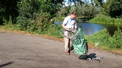 Als we de auto geparkeerd hebben, gaan we gauw aan de slag met opbouwen. Bootje klaarleggen, stangen klaarleggen en even in gedachten houden hoe we moeten opbouwen nadat we dat de vorige keer goed bekeken hebben toen het zo makkelijk ging. Er zit namelijk een slag in een van de boegstangen en dat geeft frictie als je de kielstangen vervolgens niet goed monteert. Gebruik je de juiste kanten, dan gaat het heel gemakkelijk. Rechte boegstang rechts, gebogen zijde links en dan de kielstangen met het plakkertje ook rechts houden. Kind kan de was doen en deze keer zat de kano ook in no time in elkaar. Oh ja en… die gebroken veer van een van de kielstangen is dus nog steeds niet gemaakt…..