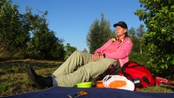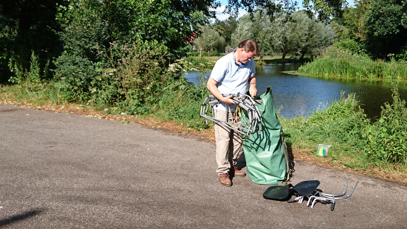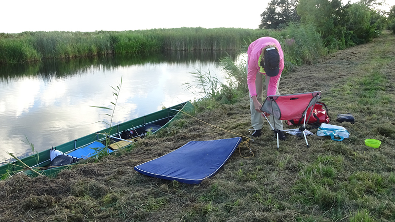 Maar uiteindelijk hebben we (bijna) alles en gaan we lekker zitten en ons maaltje klaarmaken. Helaas zitten we eerst in de schaduw van een boom en verhuizen we dus even naar een zonnig plekje. Ik heb ook de Helinox stoel meegenomen die S. voor zijn verjaardag kreeg. Helaas past hij er niet in maar ik wel.