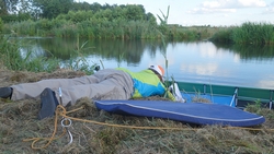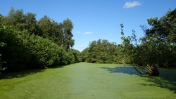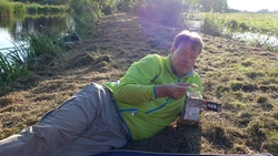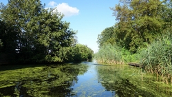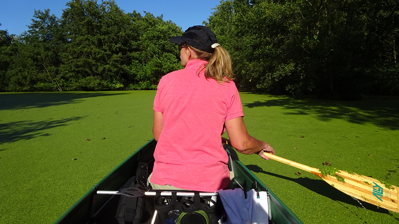 Het varen gaat niet overal even gemakkelijk want er ligt nogal wat kroos zo her en der en dat maakt het varen soms een beetje zwaar. Maar we komen prima vooruit en rustig varen we richting steiger 13. Maar als we denken dat we er bijna zijn, zien we nog helemaal geen bruggetje waar steiger 13 zou moeten liggen. We besluiten maar eens voor de verandering gewoon aan de kant aan te meren en lekker daar in het gras te gaan zitten. De kant lijkt mooi laag en deze keer hebben we eindelijk eens de schroefpin meegenomen om de boot gewoon in de grond vast te kunnen maken.