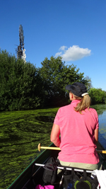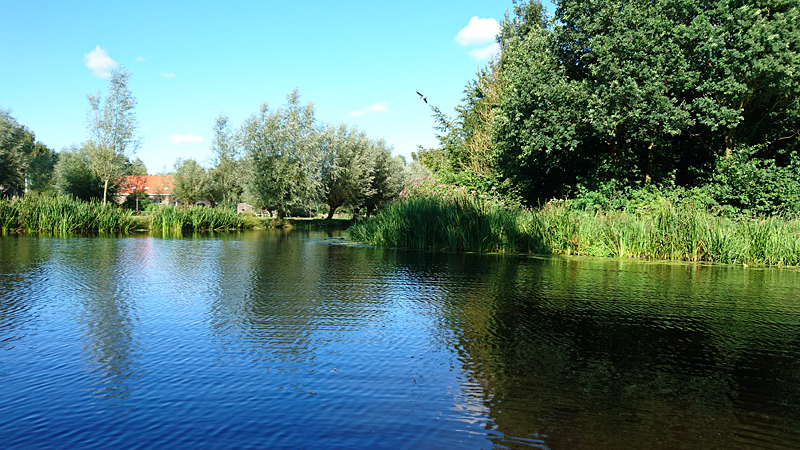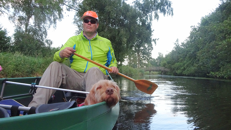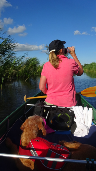 Die gekke woef vindt het gewoon weer helemaal leuk en ligt lekker te ruiken over het water en rond te kijken (of te slapen). Aan het begin van de route varen we even achter een zwaan aan die maar zielig voor ons uit blijft zwemmen. Uiteindelijk buigt de zwaan linksaf en kunnen wij ook weer door zonder het dier op te jagen. Op onderstaand video is dit zwaantje goed te zien. Even verderop vliegt een ijsvogeltje zonder het kenmerkende piepgeluid voor ons uit. Het zonnetje schijnt op zijn rug dus het blauw schittert ons tegemoet.