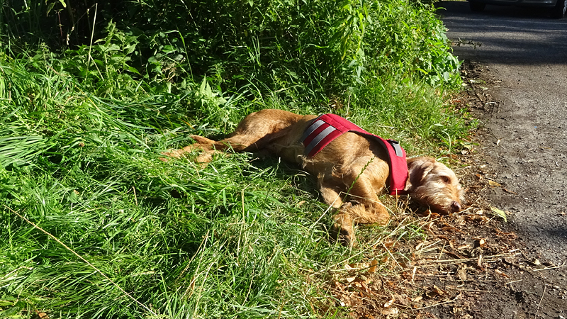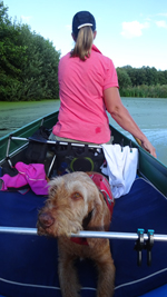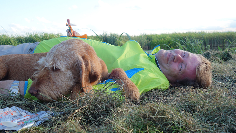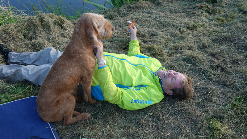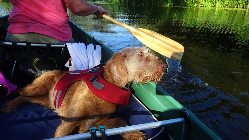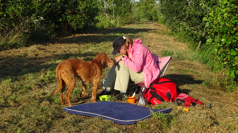 We zitten en luieren eigenlijk best lang maar als het uiteindelijk toch erg afkoelt en de zon weg is, gaan we gauw inpakken en woef even laten plassen en weer instappen. Dat instappen gaat een stuk makkelijker dan aan land klauteren en al snel zijn we weer op weg.