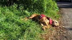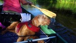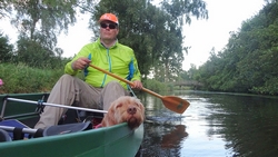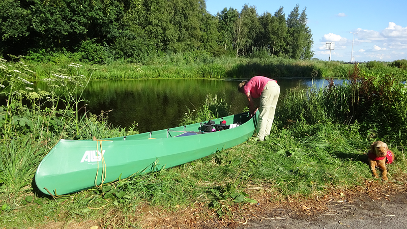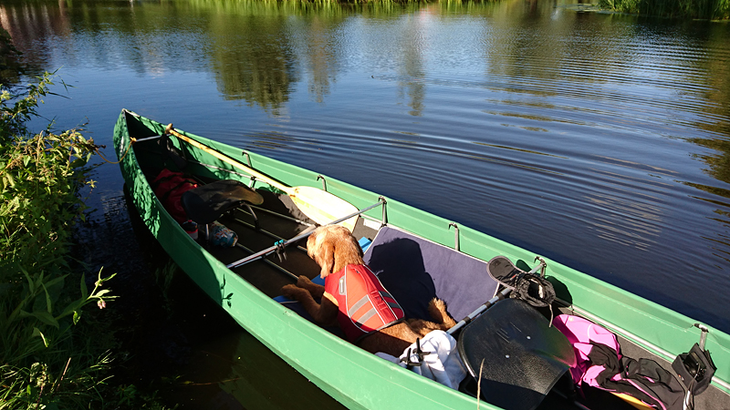 Niet veel later varen we alweer richting de auto. We zien een grote grijze wolk ineens aankomen. Het gaat toch niet regenen? We meren aan, laten woef eruit en trekken de kano op de kant. We zijn net de spulletjes aan het inpakken als het inderdaad gaat regenen. Dat valt nou even tegen en we pakken als een haas alles in. Gauw de boot droogmaken, oprollen en inpakken. Als alles in de auto zit is het alweer droog maar dat weet je van te voren niet helaas. We wandelen nog even met woef omdat het nu toch droog is en rijden naar huis.