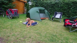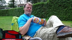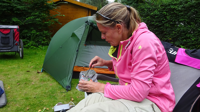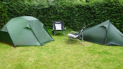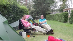 We hebben hier zo bij de heg wel een lekker plekje. Nergens andere tenten en er staan alleen achter de heg wat stacaravans waar je verder geen last of inkijk van hebt. Heerlijk rustig zo met onze twee tentjes. We betalen vandaag overigens maar 14,50 terwijl we de vorige keer (door zoonlief) maar liefst 25 euro afhandig gemaakt werden. Ergens tussenin zal het bedrag wel moeten liggen eigenlijk maar dit is prima zo.