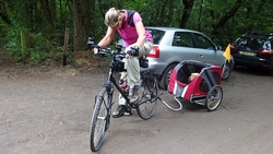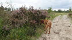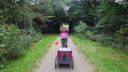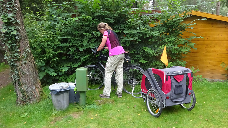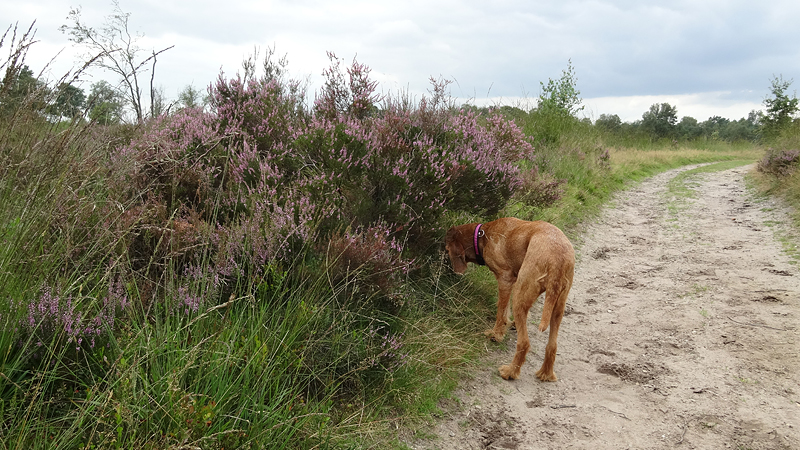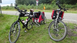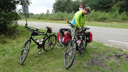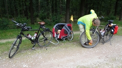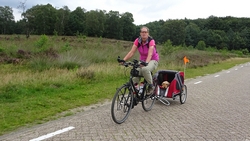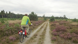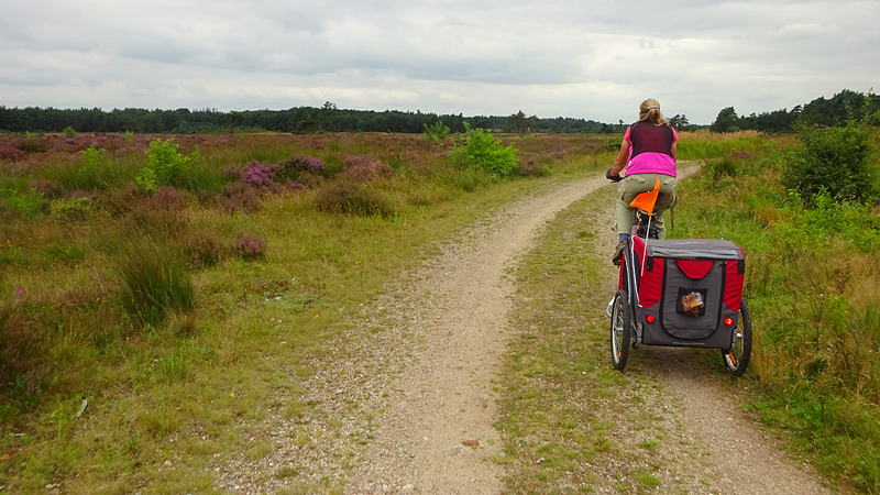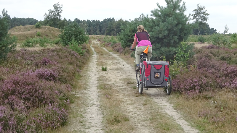 Op een gegeven moment rijden we over een bospaadje met onwijs veel plassen. Ineens is S. ontstemd want omdat ik door een plas reed, zit hij nu onder de stippeltjes met modderwater. Op zijn broek en op zijn jasje. Ik denk dat het met zijn broek wel los zal lopen want dat is zo vlekwerend maar het jasje is even afwachten. Niet leuk en we maken ook meteen de kar maar weer even schoon en de fietsen. Overigens is de route wel heel mooi zo langs de heide. Ergens staan twee fietsen midden op het pad. Als we er iets van zeggen, antwoordt de vrouw dat ‘ze met vakantie zijn’. Ja en? Alleen op de wereld blijkbaar.