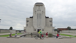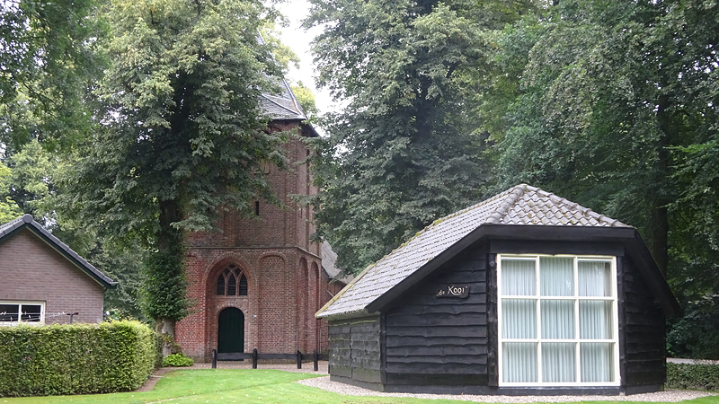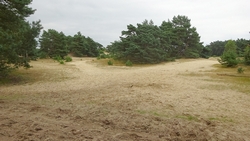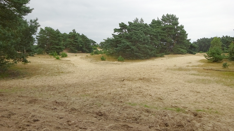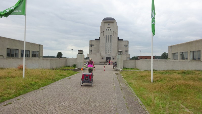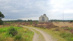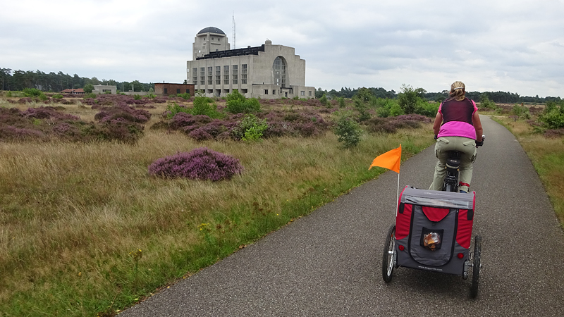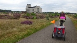 Nadat we even gekeken hebben en ontdekt hebben dat we er niet in kunnen, fietsen we door over een paadje dat volgens mij geen echt fietspad is. Het is behoorlijk zacht maar wel mooi. Achter ons ligt nog het gebouw en dat is wel aardig zo vanaf de heide.