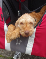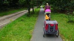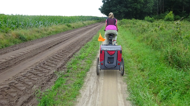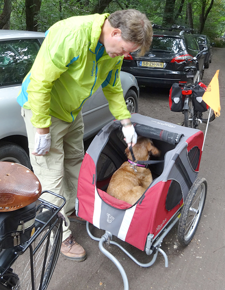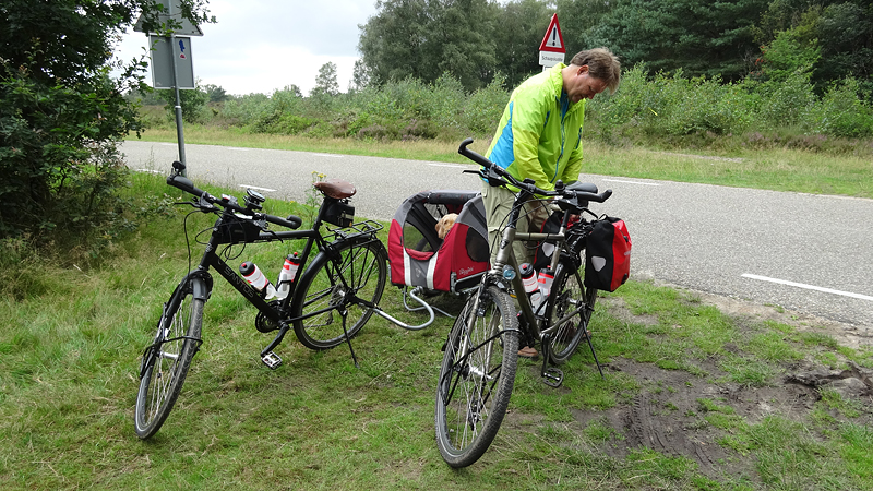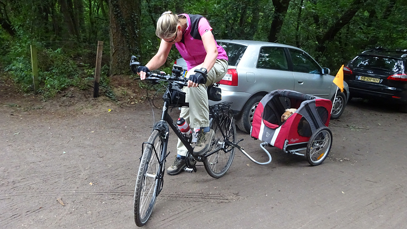Het fietsen valt om een of andere reden nog helemaal niet mee en we krijgen nog een heel stuk onwijs vals plat omhoog ook. Uiteindelijk gaat het beter als ik een beetje door ga fietsen maar bovenaan de heling stoppen we even en kan woef ook even uit de kar.