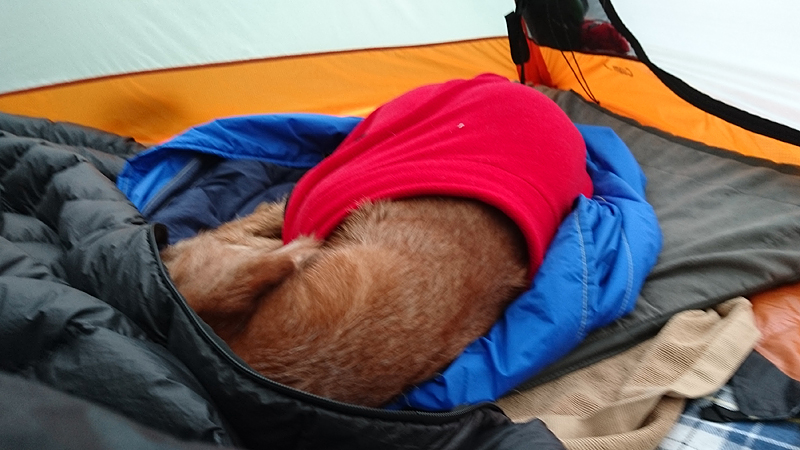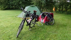 De eerste fiets dag zit er dus op en ik kruip ik mijn tentje. Het gras is akelig nat en het is best fris. Deze keer gebruik ik mijn laken er ook bij en dat is al een stuk aangenamer eigenlijk dan vannacht. Ik laat de dag even bezinken. Hoe vond ik dit nou? Het fietsen ging onwijs makkelijk en uiteindelijk stond er toch maar liefst 66 km op de teller. Op dit moment dus de langste afstand achter elkaar met woefje in de doggyride achter de kar. Niet de langste afstand op deze fiets overigens en ik fietste natuurlijk al meer dan 80 km met woefje in de kar maar met een lange pauze.