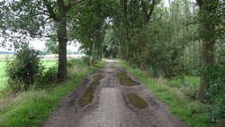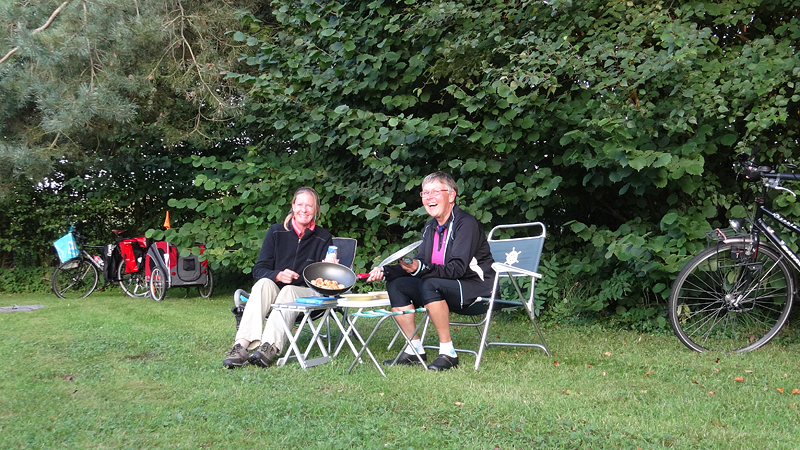 Ik praat daar nog even met twee oudere mensen die op een stoeltje zitten en telefoneer met S. over een camping tafeltje dat we bij de Lidl gezien hadden. Zo vliegt de tijd dus voorbij en ik ga gauw verder. Als ik van het pad wegrijd, zie ik dat de twee ouderen een lekke band hebben. Dat komt vast door dat kloterige pad waar we net overheen reden….