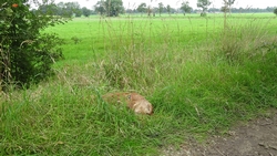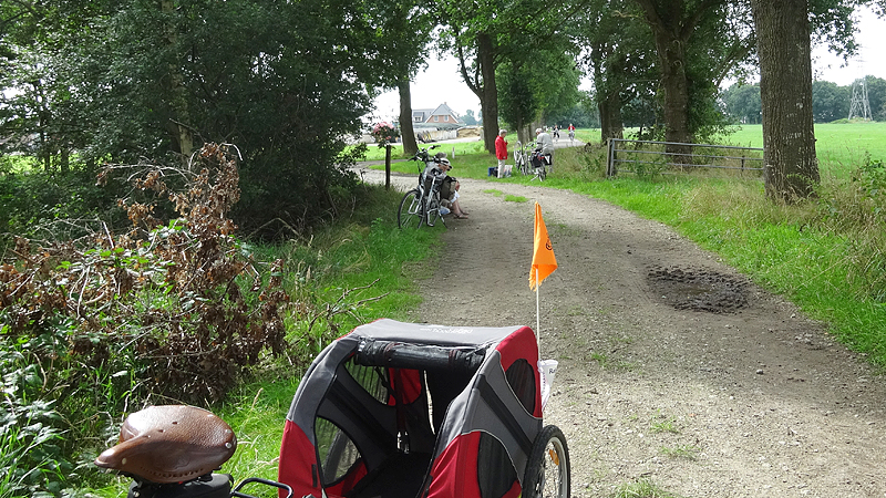 Het is niet echt mooi weer, maar de temperatuur is prima. Ik heb alleen mijn giletje aan en verder korte mouwen. Gelukkig niet teveel zon dus voor woefje ook helemaal goed en nog belangrijker: weinig wind. Ik fiets door Donkerbroek en daarna komen we in de buurt van het bos. Ik ben al een uurtje onderweg en ben niet erg opgeschoten voor mijn gevoel maar wafje moet er even uit en moet ook eten dus ik ga even van de route af voor woef. Het is inmiddels 11.37 uur.