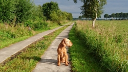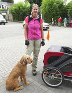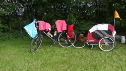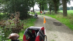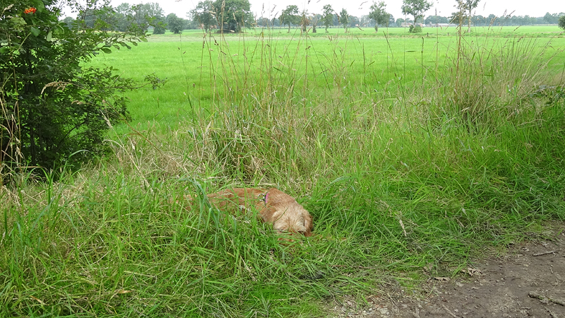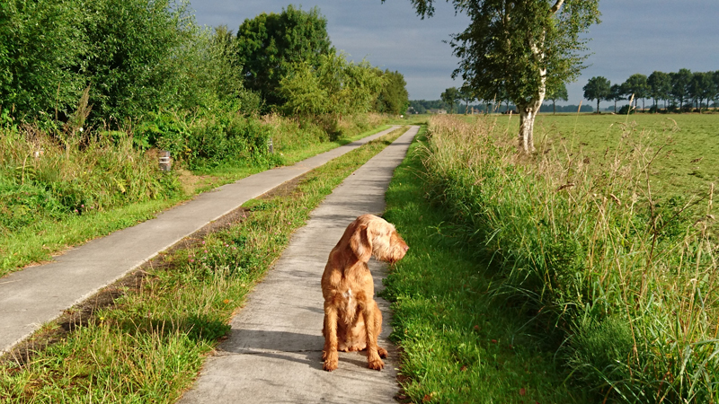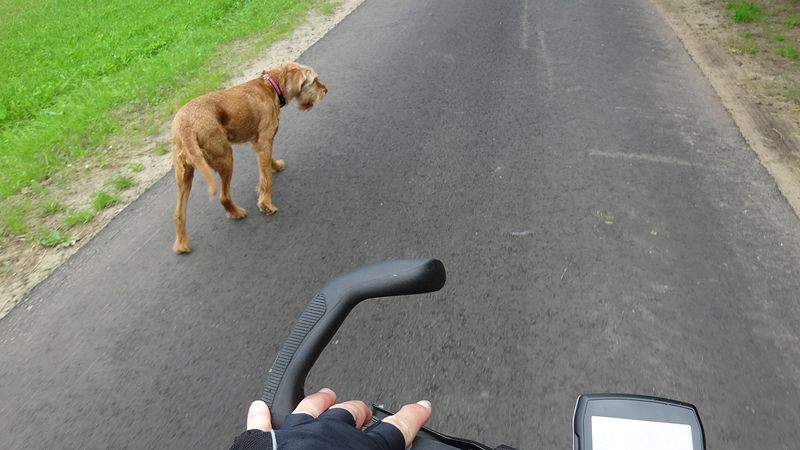 Het vreemde is, dat ik me van die eerste dag eigenlijk heel weinig herinner. Ik ben een beetje door blijven fietsen omdat ik geen idee had hoe het zou lopen op deze afstand. Ik heb natuurlijk wel 63 km gefietst in de UK maar toen hadden we de hele dag. Ik ben dus nu al voor 15 uur weer terug en dat voelt gek eigenlijk. Ik ga terug naar de camping en laat woefje het laatste rustige stukje even met de fiets meelopen zodat zij de beentjes even kan strekken. Ze is er vaak genoeg uit geweest, dus zielig is ze zeker niet. Bovendien was de kar lekker de hele dag open en kon ze dus met haar kopje in de wind alles ruiken en zien.