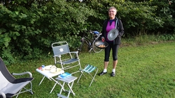 Daarna ga ik even wat lezen en wat rommelen. Ik loop ook even naar de camping beheerder om mijn pakketje op te halen. Omdat ik thuis eigenlijk te weinig maaltijden had, heb ik die besteld en hier laten afleveren. Mooi binnen een dag geleverd dus maar ik betwijfel of ik er iets van ga gebruiken aangezien ik straks eerst een salade ga nemen. Die is overigens een stuk minder lekker dan de heerlijke geitenkaas salade met walnoten en vijgensaus van gisteren. Achteraf vraag ik me wel af of dit nu verstandig is om als avond eten te nemen als het een beetje frisser is dan normaal. Met een warme maaltijd voelt het misschien toch net wat lekkerder allemaal. Gek genoeg vliegt de tijd! Mijn buurvrouw is nog niet terug en zal pas tegen 18.30 terug zijn. Tegen 20 uur gaan we samen poffertjes eten met poedersuiker.