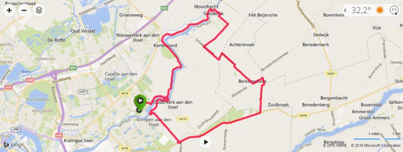 Als ik weer terugrijd via de dijk merk ik pas goed hoe warm het eigenlijk is. De zon schijnt pal in mijn gezicht en ik heb ook wat tegenwind nu. Met een bijna lege bidon gaat mijn tempo echt wat omlaag maar mijn hartslag blijft wel mooi voor deze inspanning. Zo is het ook wel genoeg. Ik rijd niet meer via Zandrak terug naar huis maar sla meteen rechtsaf om weer naar huis te rijden. Dat is iets korter maar ik vind het ook genoeg. Na 35 km sta ik weer bij de deur.