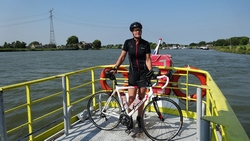 Als ik over de dijk fiets, zie ik het pontje aan de andere kant liggen en terugkomen. Misschien heb ik geluk. Als ik er sta, slaat de kerktoren 12 uur. De schipper neemt me nog mee naar de overkant samen met iemand anders die naar de slager wil en hij maakt een fotootje van mij en de fiets.