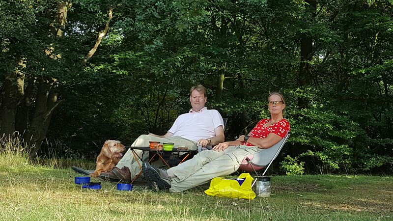 We gaan poffertjes eten in het dorp en daar kleed ik me ook snel om. Omdat het inmiddels toch al laat is en er onweer en regen verwacht wordt gedurende de nacht, besluiten we niet naar de camping in Garderen te gaan. We gaan eerst woefje uitlaten op de heide in Blaricum. Daar is het zo lekker dat ik voorstel om de stoeltjes en het lekkers tevoorschijn te halen en lekker te gaan zitten. Dat bevalt eigenlijk wel. We proberen ook het nieuwe vouwbare tafeltje en dat is handig. Woefje ligt lekker op haar gemakje op de heide te slapen en loopt wat heen en weer en krijgt natuurlijk ook te drinken en te eten.