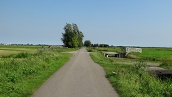Na de oversteek, sla ik linksaf en rij ik weer over de dijk. Dat rijdt prima ondanks de wind maar het is wel al werken zo in het eerste stuk. Ik sla bij de houthandel rechtsaf de polder in en sla daarna weer linksaf. Hier reed ik dus eergisteren ook al en deze weg ken ik. Wel mooi, niet helemaal geschikt voor de racefiets. Maar ik schiet lekker op en ik kijk ook om me heen. Ik zie wel de bomen lekker heen en weer wuiven in de wind. Ik doe redelijk rustig aan maar fiets wel door zo goed als ik kan. Deze afstand moet ik natuurlijk eerst even ontdekken.