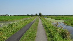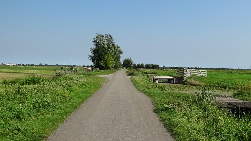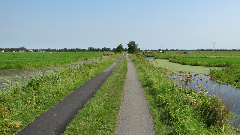Uiteindelijk ben ik in de buurt van Gouda gekomen. Dit is toch een veel mooiere route dan ik de vorige keer moest doen omdat ik niet de IJssel over kon steken met de pontjes. Nu hoef ik niet Gouda eerst door en ook niet langs die lelijke fabriek. Ideaal zo. Ik herken de route ook meteen weer en rijd rustig door. Via Haastrecht weer richting Hekendorp. Deze keer pak ik de weg over de dijk en rijd ik niet beneden door langs het water zoals de vorige keer. Ik weet dus al dat ik straks bij Hekendorp weer dat enge paadje langs de trap omlaag moet. Ik doe dat dus gewoon wandelend. Hoewel ik van plan was om op 25 km even van de fiets te stappen, doe ik dat noodgedwongen nu vast op 21 km als ik het paadje naar beneden loop. Ik wandel enkele passen en schud mijn benen een beetje uit en drink wat water. Dat water gaat best hard zie ik al, ook al nam ik nu twee 950 cc bidons mee vanwege het warme weer en de wind. Ik stap gauw weer op en ga verder. Ik ben als de dood dat ik straks niet meer op gang kom als ik te lang pauzeer ook al wandel ik dan. Van Hekendorp gaat de route via Papenkop naar Woerden. Inmiddels weet ik dat ik aan de andere kant van de spoorlijn moet rijden en ook als ik onder de snelweg door moet rijden, weet ik de route nu en dat scheelt tijd en kijken op de navigatie.