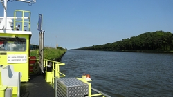 In no time ben ik daarna bij de afslag linksaf langs het kanaal naar de pont. De vorige keer twijfelde ik daar nog maar nu ga ik het gewoon nemen. Ik ben een stukje meer uit de wind en kan eindelijk weer een beetje vaart maken. Na ruim 2 km sta ik bij het pontje. Het ligt aan mijn kant maar vaart nog niet meteen weg. Ik krijg zelfs de tip om even de bidons bij te vullen uit het kraantje uit de muur en dat ga ik doen. Zo heb ik weer volop water bij me.