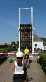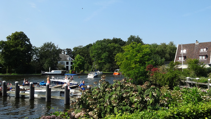 Na even wachten, vaart het pontje naar de overkant en kan ik weer verder rijden. Linksaf en weer rechtsaf. Ik herken alles nog natuurlijk. Nu richting Loenen aan de Vecht. De vorige keer was dat erg mooi. Nu overigens ook zo langs het water maar dan sta ik stil voor het eerste bruggetje. Vorige keer had ik maar 1 bruggetje dat open stond maar deze keer duurt het ontzettend lang. Zowel van links als van rechts komen plezierbootjes die onder de brug door moeten. Ik wacht en wacht nog langer. Niet enkele minuten maar echt wel tien minuten. Ik vind er niets aan maar kan wel lekker fietsen kijken zo om me heen want er komen er steeds meer. Als we eindelijk mogen rijden, rijd ik nog verkeerd ook want ik mis de afslag meteen naar rechts het water over en moet dus weer terug door de drukte van de wachtende auto’s. En als ik dan eindelijk weer op gang ben, sta ik stil voor het volgende bruggetje en moet ik weer ellendig lang wachten. Inmiddels is S. al in Laren notabene. Weliswaar veel te vroeg want ik had er nog helemaal niet kunnen zijn maar toch…..