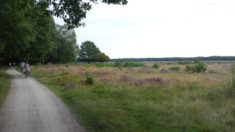 De vorige keer had ik echt nog moeite met de heide. Geen idee waarom, misschien omdat ik dacht dat ik verkeerd zat en het nog een heel eind leek. Nu gaat het prima en rijd ik gewoon lekker door ook al loopt het een beetje op en neer. Ineens vallen er 10 regendruppels uit de lucht. Ik vind het wel verfrissend eigenlijk maar verwacht is het niet want het is erg warm. Later lees ik dat er in Utrecht een plotselinge onweersbui was geweest. Die heb ik dus gelukkig helemaal gemist.