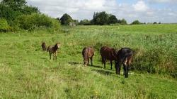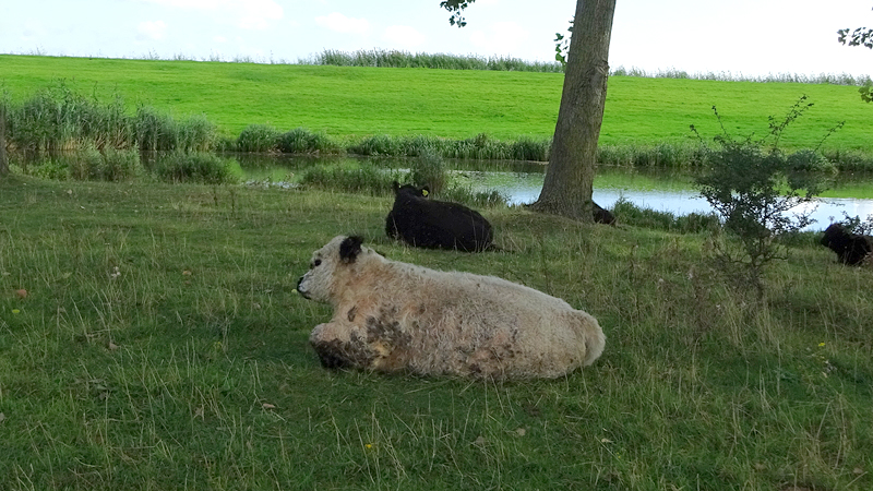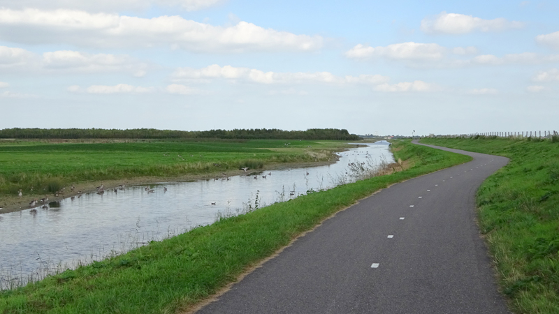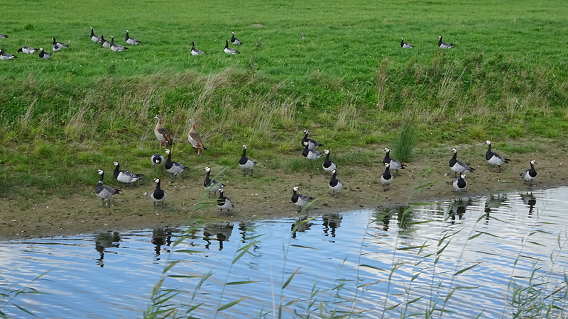 Daarna rijd ik over een stuk dat ik volgens mij echt niet herken van een vorige keer. Er komt verder geen enkel dorp meer, maar ik rijd door velden en groen met water. Ik zie enorm veel watervogels en brandganzen. Ik probeer weer rijdend een kiekje te maken.