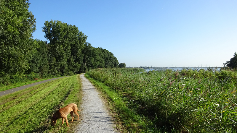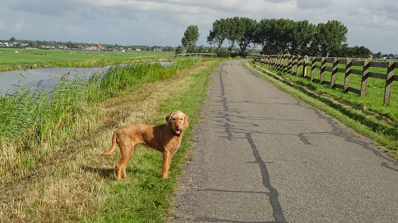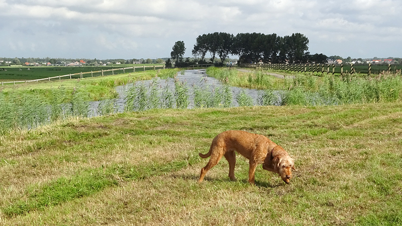 Als ik op de dijk ben, zie ik tot mijn verrassing dat de weg is afgesloten voor verkeer, en alleen voor fietsers open is. Dat is nog eens leuk rijden zo! Heerlijk rustig en het is ook een leuke weg langs het water. Ik tuf dus rustig over Zuideinde en sla aan het einde linksaf om parallel aan de weg richting Nieuwerkerk te rijden. Ik moet toch eens uitzoeken waar ik uitkom als ik rechtdoor rijd maar ik heb nu geen zin meer in verrassingen. In Nieuwerkerk even doorrijden en al snel ben ik al bijna bij Hitland. Dat gaat dus snel en ik laat in het natuurgebied weer lekker woefje uit de kar om te wandelen en te plassen.