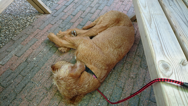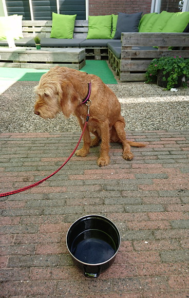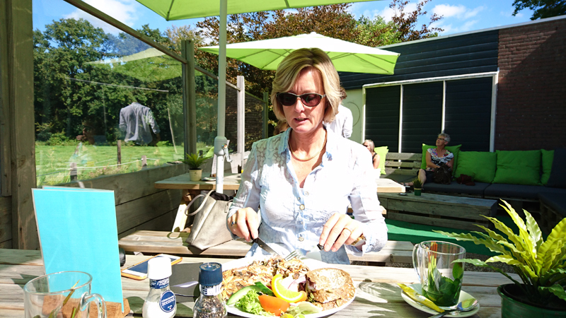 Bij mijn zusje koel ik alles even en maak alles nog even schoon. Klaar, niet meer zeuren nu en ik kleed me snel om voor de lunch. We wandelen naar Ome Nick en gaan daar lekker wat eten en drinken. Woefje is mee en krijgt water uit een mosselpan.