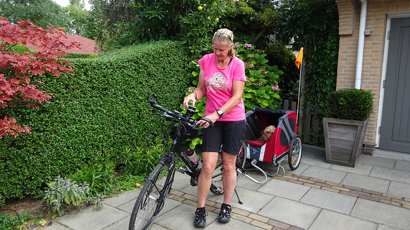 Ik sla rechtsaf over het pad en vind het een prima pad om woefje nog even uit te laten. Ik kijk op de kaart, denk na (of niet), kijk naar het pad en rem. Het volgende moment kieper ik in slow motion om met fiets en al. Ik was even vergeten dat mijn schoenen nog op de pedalen zitten. Wat ontzettend oenig. Gelukkig is het een grind/graspad en gebeurt er verder weinig. De fiets beschadigt niet omdat ik natuurlijk ‘onderop’ lig. Ik moet er wel om lachen eigenlijk. Het kost me nog moeite om mijn voet los te krijgen van het pedaal. Ondertussen kijkt wafje geinteresseerd toe vanuit de kar. Ik heb een bloedende schaafwond op mijn knie, een blauwe elleboog en een beetje pijnlijke muis. Verder niets. Kleren heel en fiets heel. Stom gedoe. Ik laat waf uit de kar en neem even tijd om mijn knie goed schoon te maken en mijn elleboog ook. Daar druk ik even op zodat het niet te blauw wordt. Ik voel verder niks. Mijn duimmuis is wel een beetje pijnlijk maar wel heel.