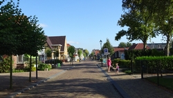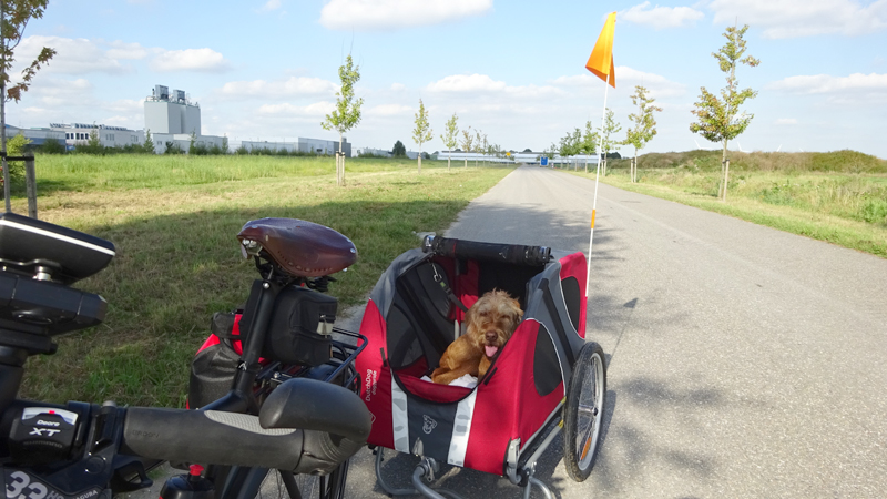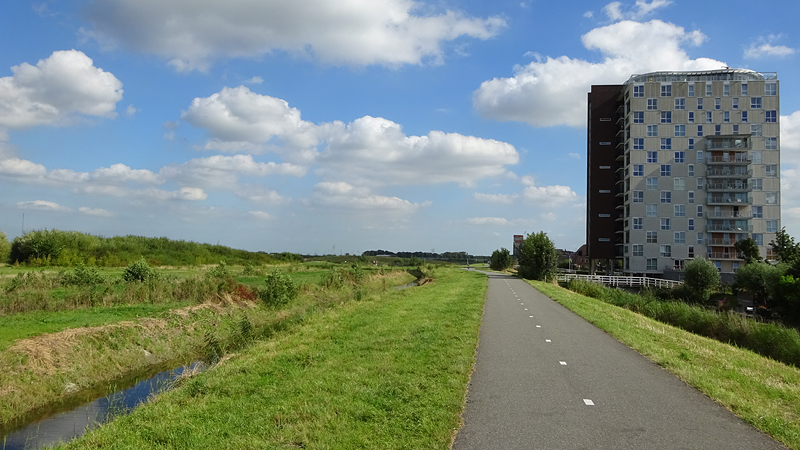. Daarna langs een nieuwe wijk die aan water gebouwd is. Het ziet er wel grappig uit maar wel allemaal nieuw. Het is een buitenwijk van Zoetermeer. Ook hier is het allemaal heel groen. Ik laat woefje ook weer even uit de kar.