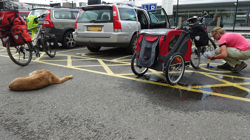 In de ochtend zijn we vroeg op en leggen alle tassen in de auto. Alles is al gepakt, we hoeven alleen nog wat sandwiches te smeren eventueel voor onderweg of voor morgen. Altijd goed om mee te hebben ook al hebben we een gasbrander en maaltijden bij ons. Woef is bang dat we haar zullen vergeten en blijft gewoon voor de auto zitten wachten.