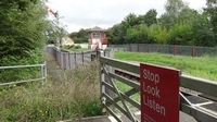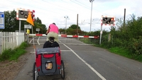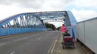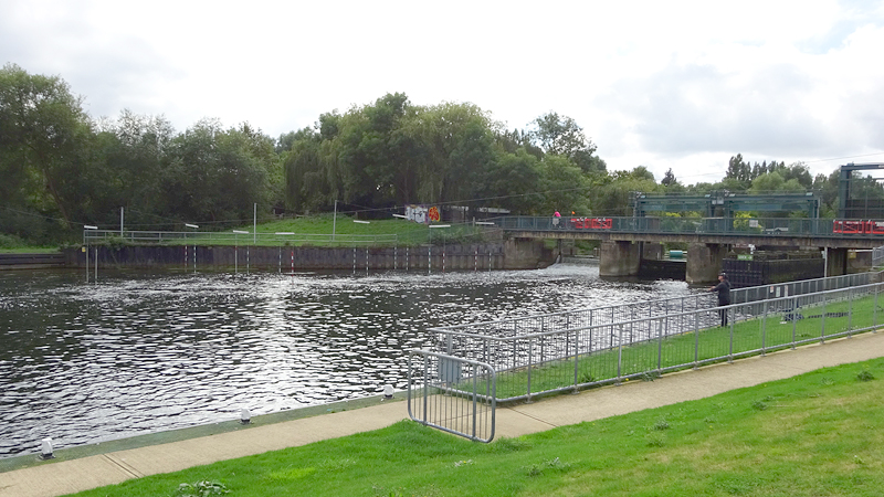 Aan het einde is een wildwater kano baan. Er vaart jammer genoeg niemand. We steken de brug over en komen bij een hek over een spoor. Het blijkt nog best lastig te zijn om die zware hekken open te doen en open te houden.