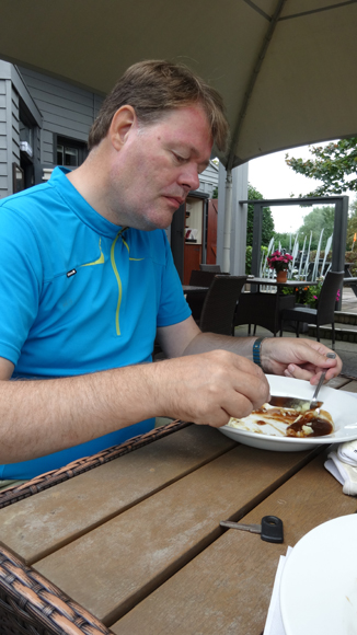 Inmiddels is het al 1 uur geworden en we besluiten – ondanks dat we pas net vertrokken zijn voor de tocht – wat te gaan eten bij een restaurantje aan het water hier. Het is immers bijna uitgesloten dat we de eerste lunchplek op tijd gaan halen. Ik had een leuke tent in Ufford uitgezocht of in het verderop gelegen Barnack. Dat halen we niet dus gaan we buiten maar een hapje eten.
