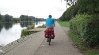 We fietsen langs een roeibaan. Niet echt een grote roeibaan trouwens maar wel lekker groen en niet zo open als de roeibaan in Zevenhuizen.