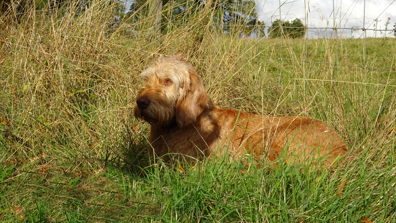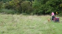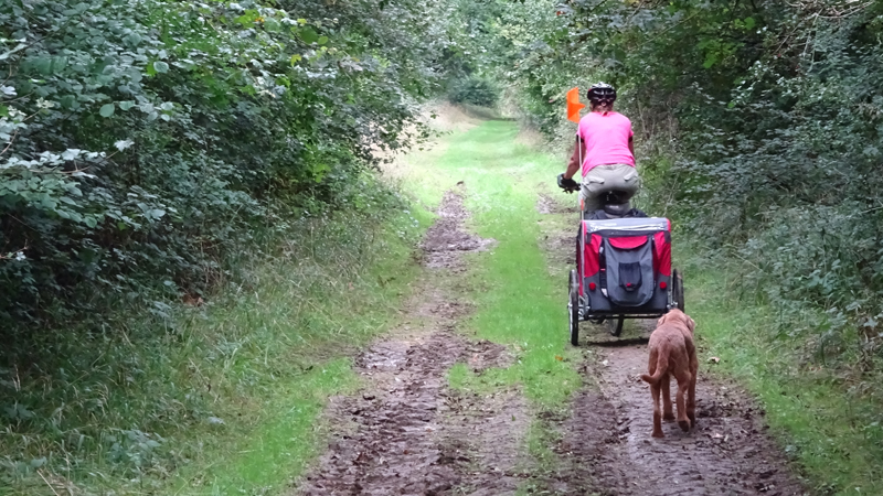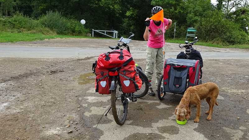 Het is best modderig en nat maar we komen overal wel overheen met de fiets zeker omdat woefje lekker losloopt naast de fietsen. Dat trekt toch net een stukje makkelijker. Om even voor 3 uur rijden we de hanglands uit en geven wafje wat water.