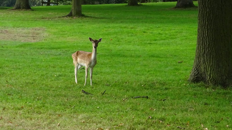 Als we even aan de voorkant hebben gekeken en wat foto’s hebben gemaakt (waarom hebben we nou geen drone bij ons), rijden we door het park. Dat lijkt volgens de kaart te kunnen en we zien ook nergens dat het niet zou mogen. Nu zie ik overigens op de site ook gewoon staan dat het park geopend is voor publiek. Dat had ik dus – ondanks de voorbereiding niet gevonden – dus het is nu wel erg leuk natuurlijk dat we ook echt doorheen kunnen fietsen. We rijden verder en hebben nog meer mooie uitzichten op het House en op de dieren in het Deer Park.