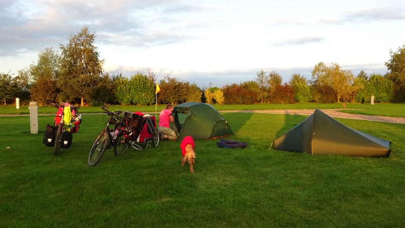 Na een heerlijk diner gaan we weer richting de tentjes. We fietsen rustig terug en laten woefje uit de kar bij de oprit naar de campsite zodat ze lekker kan plassen. Ik ga haar straks vanuit de doggyride zo de tent in doen want dan is ze niet zo nat. Inmiddels is het aardig vochtig buiten en als we bij de tentjes komen, is alles al enorm nat. Geeft niet, binnen is alles immers droog.