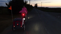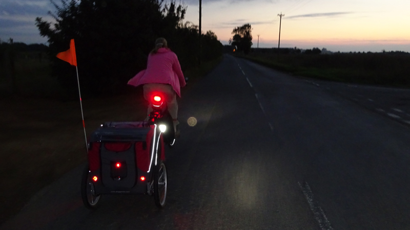 Voor het eerst zullen we in het donker fietsen dus ik monteer de Lezyne lampen op mijn fiets. Op de doggyride zit aan de achterzijde ook nog de Ruffwear beacon die veel licht geeft dus ik ben net een kerstboom. Als we alles hebben, rijden we weer terug naar Baston voor ons avond maal.