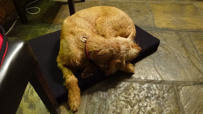 Natuurlijk is de terugweg naar het restaurant een stukje korter voor ons gevoel want nu weten we waar we moeten zijn. We hebben een tafeltje gereserveerd dus we staan niet voor niets voor de deur straks. We krijgen een tafeltje aan het raam en kunnen dus de fietsen zien staan en we hebben ook ruimte voor woef die lekker ligt te slapen op haar bedje.