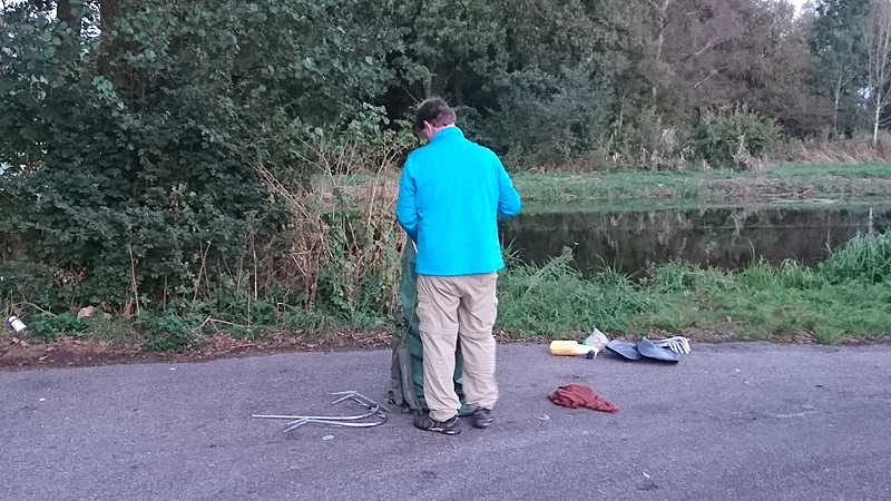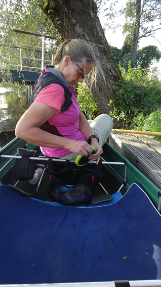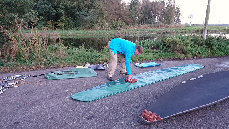 Zo vertrekken we dus redelijk laat al naar het Loetbos. Niets ingewikkelds, gewoon lekker dichtbij en een route een beetje tussen de bomen dus geen last van de wind. Eerst dan maar even snel opbouwen en hoewel de voorkant niet zo mooi zit uiteindelijk, gaat dat eigenlijk heel snel. Ik weet gelukkig nog hoe die stangen erin moeten dus dat gaat steeds makkelijker (stickertjes aan de kant van de gebogen boegstang op de kielstang). Alleen moeten we wel de stangen gewoon alvast klaarleggen want dat werkt net ietsje sneller. Maar in no time zit de boot in elkaar en omdat we 2 tassen gebruiken, is het verder verdelen van de spulletjes ook heel makkelijk. De spulletjes voor op de boot zitten al in de rack pack en de overige dingen in de kanozak. Kind kan de was doen en al snel ligt de boot in het water en stapt woef er ook vast in!