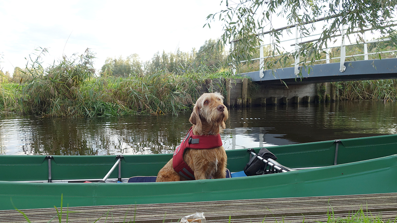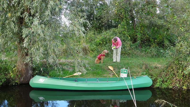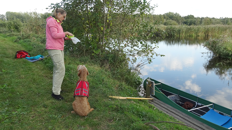 Na ruim 4 kilometer komen we bij het steigertje en leggen we aan. Het is ook tijd om wafje wat eten te geven dus dat is goed gepland zo.