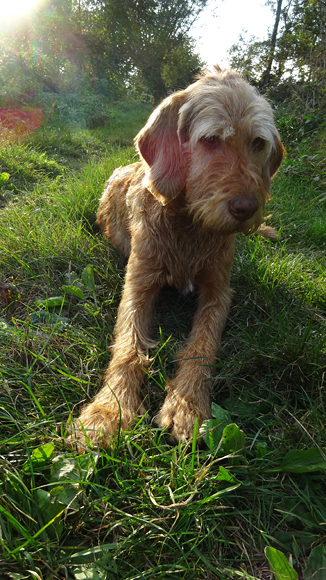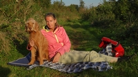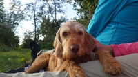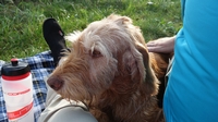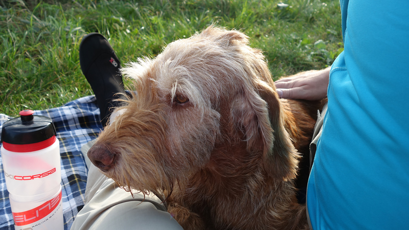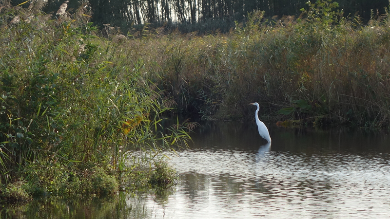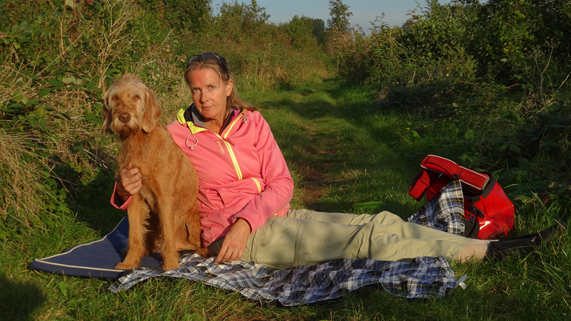 Het is altijd even prettig om lekker te luieren en we kiezen een plekje in het late middag zonnetje en rollen ons kleedje uit. Wafje heeft al gegeten en ik ga haar ook even uitlaten langs het water. Daarbij zie ik nog een zilverreiger die ik probeer te kieken.