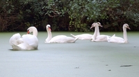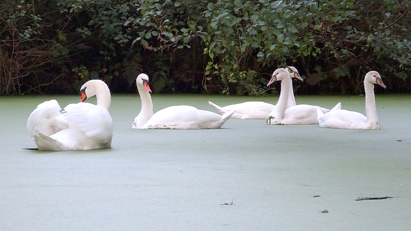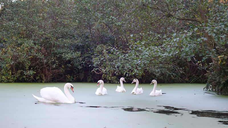 Een zwanen familie zwemt voor ons uit. Even een kiekje!